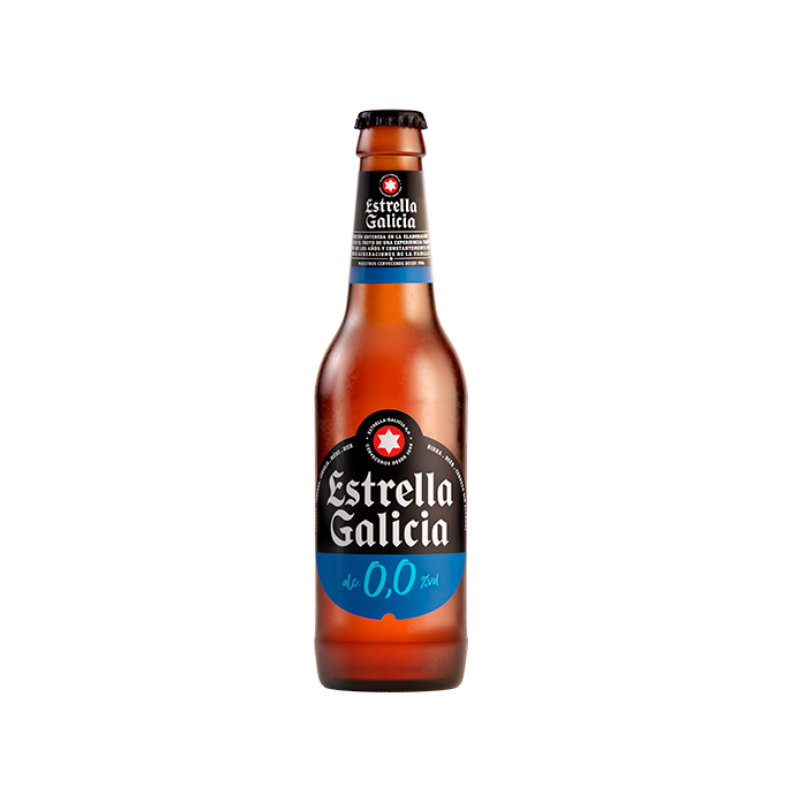 Estrella Galicia 0.0 is a non-alcoholic beer from the Galicia region in Spain. It boasts a bright golden color, typical of Pilsner-style beers. This beer is brewed through an interrupted fermentation process, featuring aromas of malt, cereals, with floral and hoppy notes. On the palate, it is slightly bitter with a pleasant sweetness. Each pack contains 4 sets of 6 bottles of 25cl
