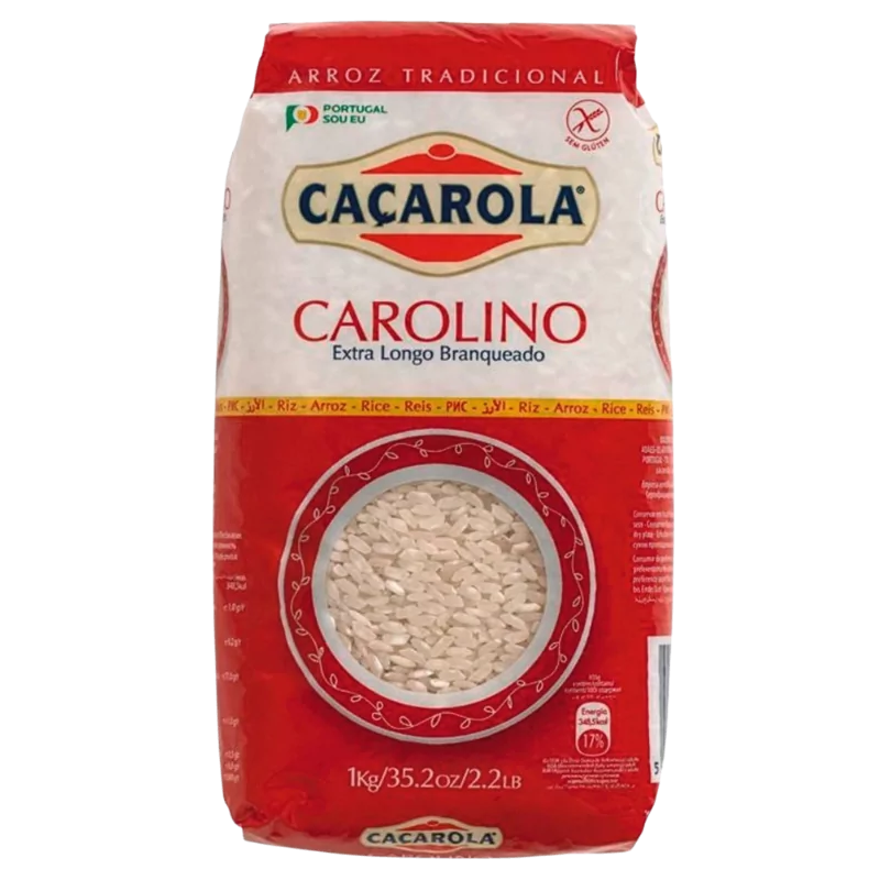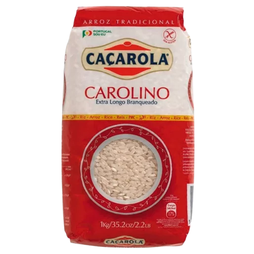 Arroz Caçarola Longo Carolino est un riz à grains longs, très populaire au Portugal. Il absorbe totalement l'eau et les assaisonnements pendant la cuisson, devenant crémeux et délicieux. Chaque paquet contient 10 sacs de 1 kg. Valeurs nutritionnelles pour 100 g : énergie 1479,5 kJ / 348,5 kcal, lipides 1,0 g (dont saturés 0,2 g), glucides 77,8 g (dont sucres <1 g), fibres 0,5 g, protéines 6,9 g, sel 0,008 g